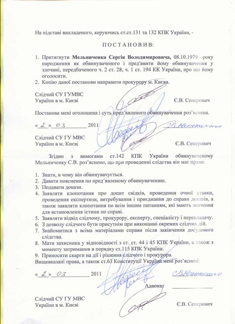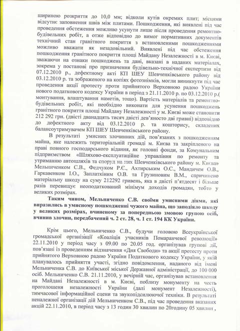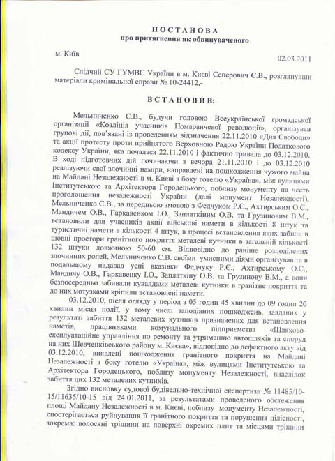 Вранці 2 березня слідчий Є.В.Сеперович пред’явив організатору Підприємницького Майдану, голові Коаліції учасників Помаранчевої революції Сергію Мельниченку обвинувачення у скоєнні злочинів, передбачених ст.ст. 28 ч. 2, ст. 194 ч. 1 – «Умисне знищення або пошкодження чужого майна, що заподіяло шкоду у великих розмірах» - тобто, якщо перекласти постанову про притягнення як обвинуваченого на загальнозрозумілу мову, то виявляється, що Сергій Мельниченко, маючи злочинний умисел пошкодженння гранітної плитки на Майдані Незалежності з боку готелю «Україна», вступив у попередню злочинну змову з громадянами Федчуком, Ахтирським, Мандичем, Гаркавенком, Заплаткіним і Грузиновим. Сергій Мельниченко створив з них злочинне угрупування, в складі якого, реалізуючи свої злочинні наміри, направлені на пошкодження чужого майна, скликав на Майдан Незалежності до 100 тисяч підприємців з ріних областей України, а потім, відповідно до раніше розподілених злочинних ролей, віддавав усні розпорядження подільникам, а вони забивали кувалдами металеві кутники у гранітне покриття.