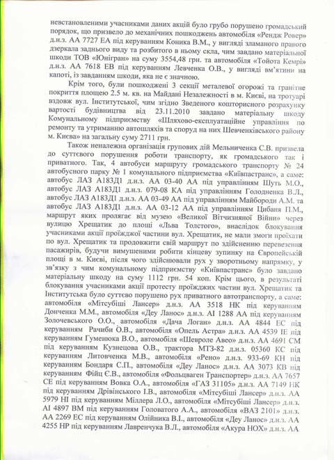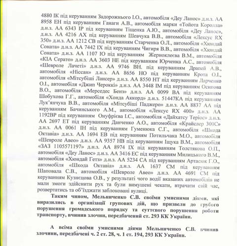 Окрім того, Сергія Мельниченка як організатора акції, на відміну від інших учасників, звинувачують також у «організації групових дій, які призвели до грубого порушення громадського порядку» – ст.293 КК України. Виявилося це в тому, що під час проходу демонстрантів по вул.Інститутській «були пошкоджені 3 секції металевої огорожі та гранітне покриття площею 2,5 кв.метри на тротуарі, чим завдано шкоди … на суму 2711 гривень» – цікаво, чи то не дівчата своїми гострими підборами попробивали кам’яну бруківку? Крім того, вважає слідство, «невстановленими учасниками акцій … пошкоджено автомобілі «Рендж-Ровер» і «Тойота-Кемрі». Пригадується старий одеський анекдот: на могилі напис «Тут поховано невідомого солдата Іосифа Рабиновича». Туристи запитують у місцевих: «Чому написано «невідомий солдат», якщо його ім’я Іосиф Рабинович?» Місцеві відповідають: «Бо ніхто не знає, чи був Іосиф солдатом». А тут навпаки – «невстановленими учасниками акції» пошкоджено машину. Але якщо порушники невідомі, то звідки могло стати відомо, що вони були учасниками акції? Чи міліція усі пригоди, які сталися у Києві за ці дні, спише на «учасників акції», які діяли відповідно до «злочинного умислу» Сергія Мельниченка з пошкодження гранітної плитки?