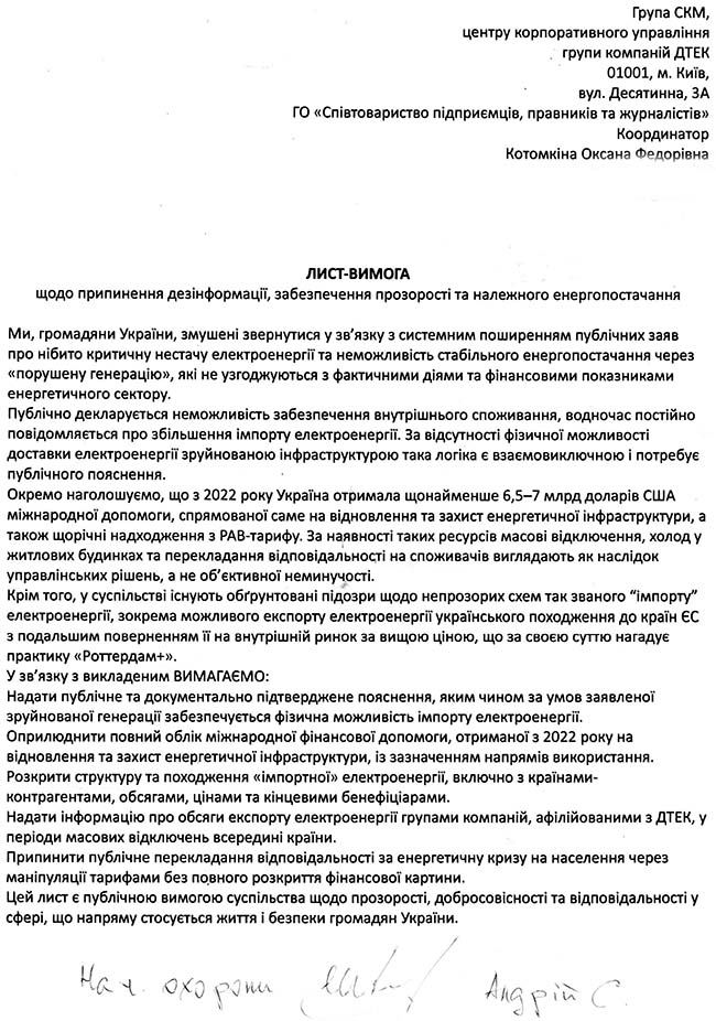 Саме в такій атмосфері подвійних стандартів, цензури та підміни понять публічний спротив стає не правом, а необхідністю. Тому на тлі повного управлінського свавілля і відвертого знецінення людського життя 21 січня в Києві відбулася публічна акція громадян та представників ГО «Співтовариство підприємців, правників та журналістів», під час якої було передано офіційний лист до Групи СКМ та центру корпоративного управління ДТЕК із вимогою припинити дезінформацію в енергетичній сфері, надати прозорі пояснення щодо відключень електроенергії та розкрити використання коштів, отриманих на відновлення енергетичної інфраструктури.