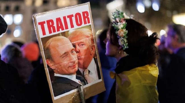 Демонстрант із плакатом «Зрадник» на Трафальгарській площі в Лондоні, Велика Британія, 24 лютого 2026 року. Фото РАР