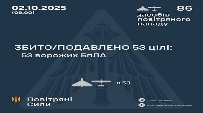 Збито та подавлено 53 ворожих БпЛА02.10.2025 15:08