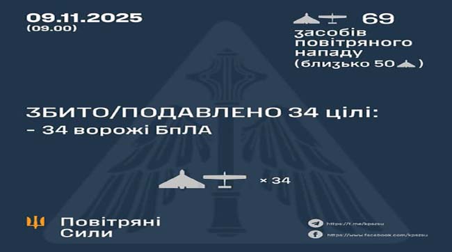 Збито та подавлено 34 ворожі БпЛА09.11.2025 09:22