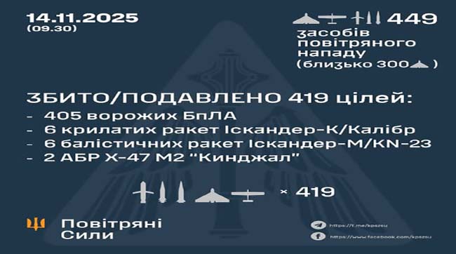 У ніч на 14 листопада (з 18:00 13 листопада) противник завдав комбінованого удару по об’єктах критичної інфраструктури України із застосуванням ударних БпЛА, ракет повітряного, наземного та морського базування.