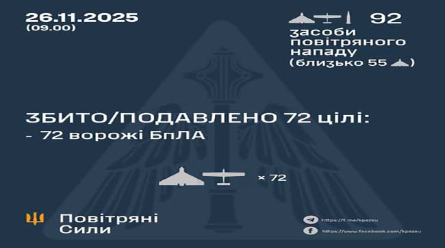 Збито та подавлено 72 ворожих БпЛА26.11.2025 11:29