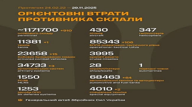 з 24.02.22 по 29.11.25 орієнтовно склали / The estimated total combat losses of the enemy from 24.02.22 to 29.11.25: