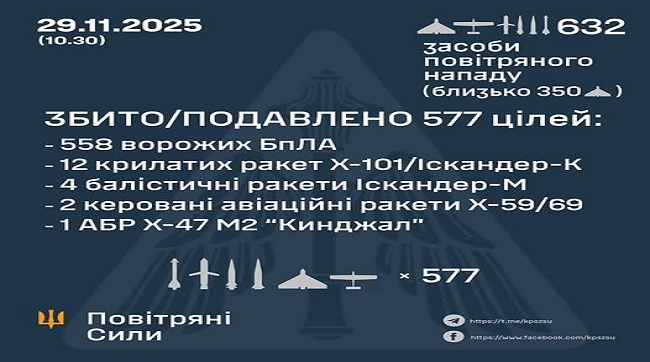 Збито та подавлено 577 цілей противника29.11.2025 08:47