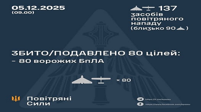 Збито та подавлено 80 ворожих БпЛА05.12.2025 08:37