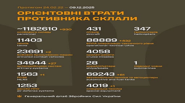 з 24.02.22 по 09.12.25 орієнтовно склали / The estimated total combat losses of the enemy from 24.02.22 to 09.12.25: