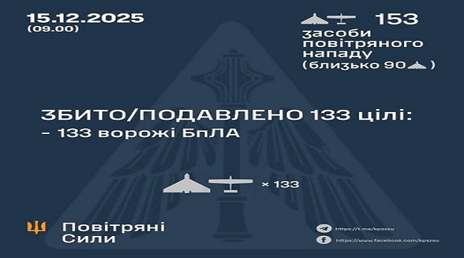 Збито та подавлено 133 ворожі БпЛА15.12.2025 09:11
