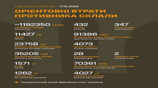 з 24.02.22 по 17.12.25 орієнтовно склали / The estimated total combat losses of the enemy from 24.02.22 to 17.12.25: