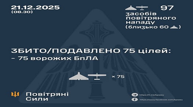 Збито та подавлено 75 ворожих БпЛА21.12.2025 09:17