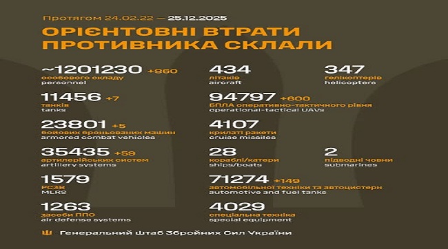 з 24.02.22 по 25.12.25 орієнтовно склали / The estimated total combat losses of the enemy from 24.02.22 to 25.12.25:
