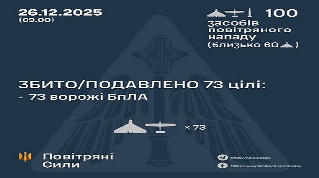 Збито та подавлено 73 ворожі БпЛА26.12.2025 11:38