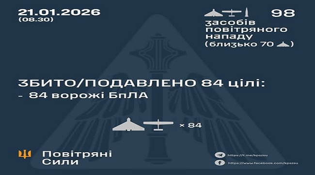 Збито та подавлено 84 ворожих БпЛА21.01.2026 09:18