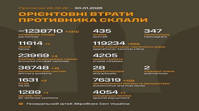 з 24.02.22 по 30.01.26 орієнтовно склали / The estimated total combat losses of the enemy from 24.02.22 to 30.01.26: