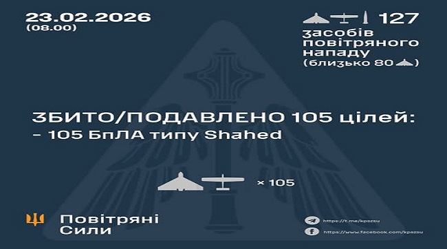 Збито та подавлено 105 ворожих БпЛА23.02.2026 09:08