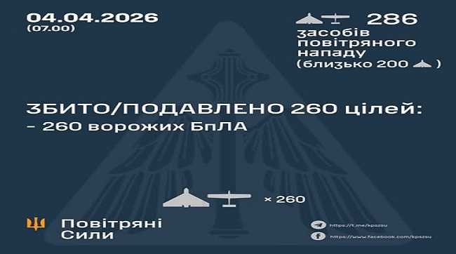 У ніч на 04 квітня (з 18:00 03 квітня) противник атакував 286 ударними БпЛА типу Shahed, Гербера, Італмас та безпілотниками інших типів із напрямків: Шаталово, Брянськ, Курськ, Орел, Міллєрово, Приморсько-Ахтарськ – рф, близько 200 із них – «шахеди».