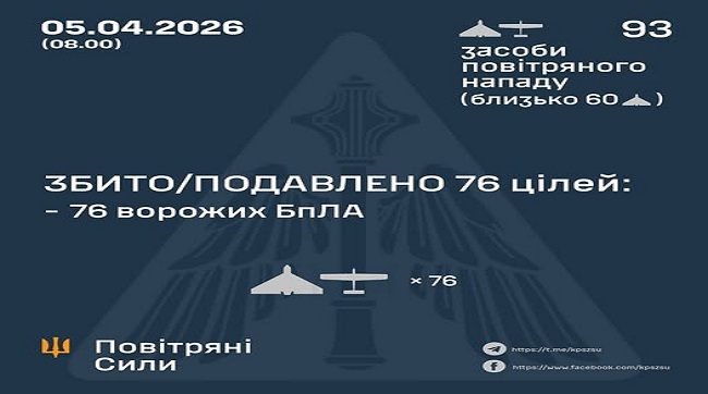 Збито та подавлено 76 ворожих БпЛА05.04.2026 09:25