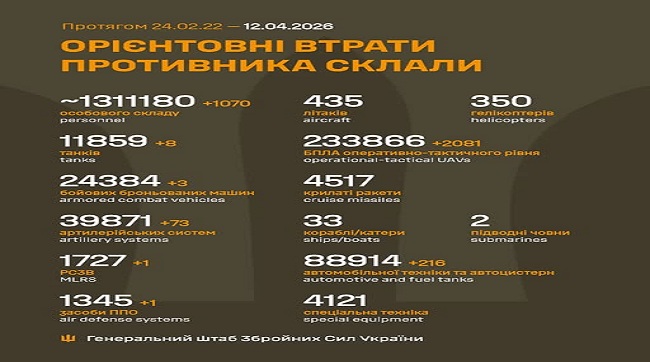 з 24.02.22 по 12.04.26 орієнтовно склали / The estimated total combat losses of the enemy from 24.02.22 to 12.04.26: