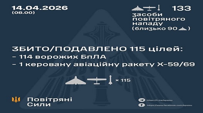 Небо під захистом: збито ракету та 114 ворожих дронів!12.04.2026 09:35
