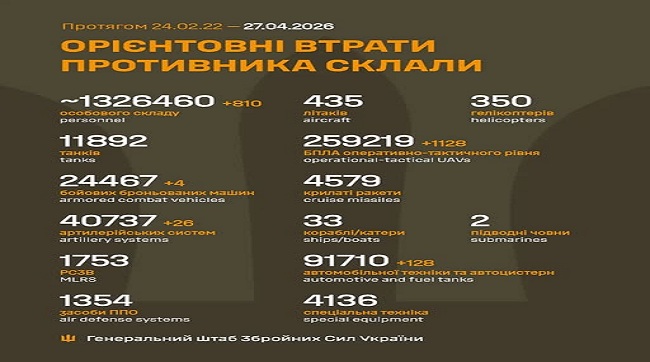 з 24.02.22 по 27.04.26 орієнтовно склали / The estimated total combat losses of the enemy from 24.02.22 to 27.04.26: