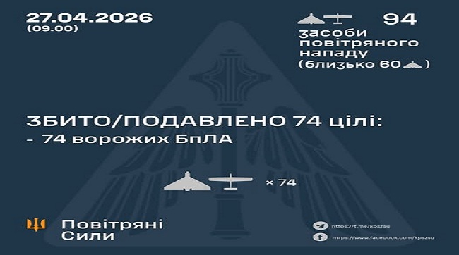 Збито та подавлено 74 ворожих БпЛА27.04.2026 11:03