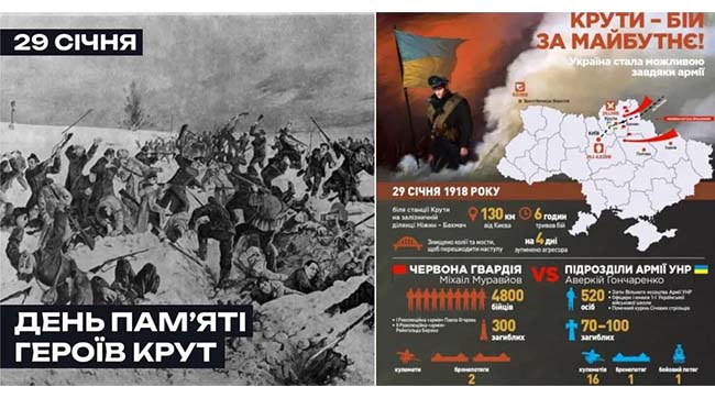 P.S. 29 січня – річниця бою під Крутами 1918 року. 108 років тому близько 500 українських воїнів зупинили на певний час трьохтисячну більшовицьку армію Муравйова. Ця битва символізує патріотизм, стійкість і самопожертву української молоді в боротьбі за державність. Міжнародне визнання української незалежності – це те, чим завдячуємо Героям Крут. Затримавши російського ворога на чотири дні біля залізничної станції Крути, київські юнаки дали змогу владі УНР розгромити повстання російської п’ятої колони під назвою «повстання на заводі Арсенал» у Києві, а головне – укласти Брестський мирний договір із країнами Четверного союзу й досягнути визнання УНР суб’єктом міжнародних відносин. Під Крутами загинуло, за різними оцінками, до 100 українських оборонців, у тому числі 27 вояків Студентської чоти, які потрапили в полон до рашистів і були вбиті. Сьогоднi вiдомi прiзвища 20 з них. Російські втрати тільки вбитими були щонайменше 300 загарбників. На початку березня 2022 року неподалік місця подвигу Героїв Крут знову відбулися бої захисників України з російськими окупантами, які наступали на Київ. Через 104 роки під Крутами наші війська зупинили наступ ворога, завдали йому болючих втрат, захистили місто Ніжин на Чернігівщині. Хоробрість та жертовність крутянців зробила їх символом героїзму та самопожертви молодого покоління в боротьбі за незалежність України! Сьогодні, як і 108 років тому, ворог той самий! https://uinp.gov.ua/informaciyni-materialy/antymif/mif-pro-300-spartanciv-geroyiv-krut-yakyh-centralna-rada-kynula-na-ubiy (фото)», - пише КРИМський бандерівець.