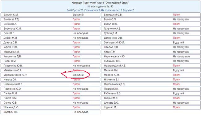 Нардеп від Оппоблоку Юрій Мірошниченко, який раніше був членом партії регіонів і представником у ВР біглого президента януковича, під час обговорення законопроекту щодо зовнішньополітичного курсу України (вступ України в НАТО – ред.), досить лукаво запропонував починати розгляд питань національної безпеки в першу чергу з питань розвитку економіки, а вступу до міжнародних безпекових організацій має передувати серйозна дискусія. Після чого регіонал запропонував розглянути законопроект лише в першому читанні. При цьому виступаючий з трибуни Юрій Мірошниченко під час поїменного голосування за вступ України до НАТО був зазначений як «відсутній».